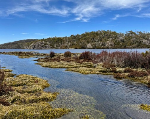 The views were fantastic from the top in a rare cloudless day - we could see all the way to Barns Bluff and Cradle Mountain and even beyond. Despite dawdling on the way down including stopping for Jo to take a dip in one of the tarns, we were back at camp by 11am. Our original plan was to take a lunch break and then head up another of the nearby peaks despite the route looking slightly perilous as it was covered in snow. When Jo suggested that instead we take advantage of the continued good weather to move ourselves to a new campsite, thus making the walk out in the rain the next day a much more managable distance we all immediately agreed and packed up our gear after lunch. The next campsite was down at Lake Adelaide - about 5 kms away. This part of the route was new and made it possible to do a nice loop rather than having to just walk in and out. It was a beautiful trip down through a pencil pine forest then alongside Lake Walls with a final little saddle over then down to Lake Adelaide. Unfortunately the campsite wasn't as adjacent to the lake as we would have liked but it was still nice. I should say that the toilets at both campsites were incredibly civilised and pretty much brand new. Quite the hiking treat.