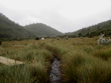 As I mentioned before, on the map it looked like we now had an easy 3k walk which would steadily descend to Lake Tahune, where I had imagined there would be a delightful open grassy plain next to the lake for camping, and I’d sit in the sun and relax in the afternoon light (you know, once the fog and light drizzle cleared). With this thought in my mind we finished our snacks and left the pass, expecting to be eating lunch by the lakee in 40 minutes or so. It was two hours later that we reached maximum frustration point (as per the prologue). It wasn’t that it was THAT bad, but it was more that the reality wasn’t matching our expectations. We’d walked and walked and huffed and puffed up and down steep pinches, and scrambled over scree, and plodded through mud and we STILL weren’t in sight of the lake. Or even a flat surface that someone could think a lake could reside. It seemed endless. But of course it wasn’t and about 20 minutes past the maximum frustration point (MFP) we descended a set of stairs and suddenly saw a camping platform. Like Lake Vera, Lake Tahune and surrounds were nothing like I’d imagined. There was no nice-open area next to the lake, it was just tight dark vegetation right down to the water, with about a metre wide access point if you wanted to swim. I would have called it a tarn rather than a lake as it had steep sides all around. The hut certainly didn’t look very inviting either - although I appreciate that a lot of work goes on to maintain it. Clare and I were pretty adamant we’d camp rather than suffer the noise (and after all, we’d carried our tent all this way), In contrast to the hut, the camping platforms were actually pretty new and clean - so we grabbed one and put up our tent before the rest of the day’s hikers rolled in. (there were a lot due to the Australia Day long weekend).