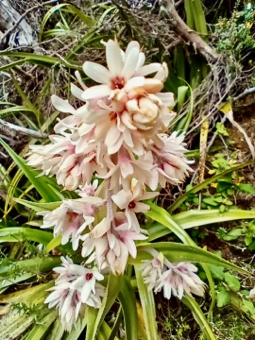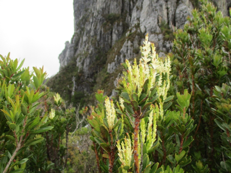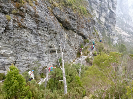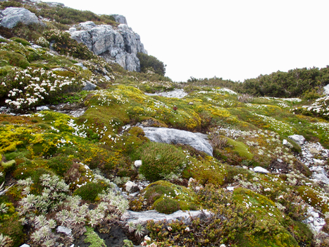 everyone looking exhausted Bleeding noses and general suffering aside, we made Barron Pass after about 2 hours and were rewarded with fantastic views. I’d warned everyone about the next section (as the mistake I’d made last time was expecting it to be a cake-walk down to the next hut - so the toughness of it was amplified by the discrepancy between my expectations and the reality). In the end it was fine - in fact with the great views, once we’d got past the most arduous section, most of us were able to appreciate the amazing botanical garden type terrain and incredible views. We could see people up on Frenchmans Cap way above us, and we could see all the way back to the Lyell Highway in some spots. As the weather was so nice we stopped a lot - unlike last time when it was a bit wet to linger anywhere.