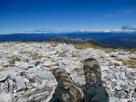 Tahune Lake Hut After some lunch and a short lie-down, the weather cleared (just like the forecast said it would), so it was time to grab our daypacks and head up to the summit, just 1.5km but 450metres in elevation away. It was a steep walk, but absolutely beautiful and we made it in just under 90 minutes. There were a couple of hairy bits, but generally it was a pretty easy climb, if there is such a thing.
