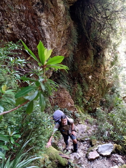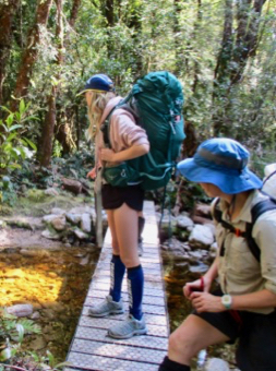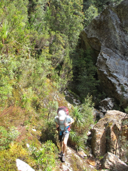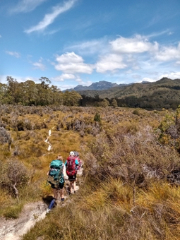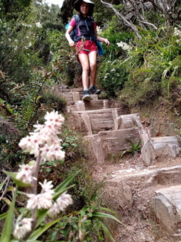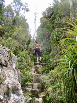 Where day 1 offered boardwalks and raised dry walking (mostly), day 2 offered rocks, roots, scrambles, climbs, steps, scree, footholds, and of course, mud. Luckily not usually all at once. Our first big challenge on day 2 was the climb up to Barron Pass. It’s a 300m climb over 2k, starting from the end of Lake Vera. It was an amazingly well constructed path, but there’s only so much that can be done to ease the strain of that sort of climb which would be tough even without a pack. The scenery was great though - it was mostly beautiful rainforest with occasional waterfalls and glimpses of the rocky ranges high above. It took us 2 hours to make it to the top.. this is the final staircase, and Clare and Leo coming up it. .jpg)