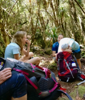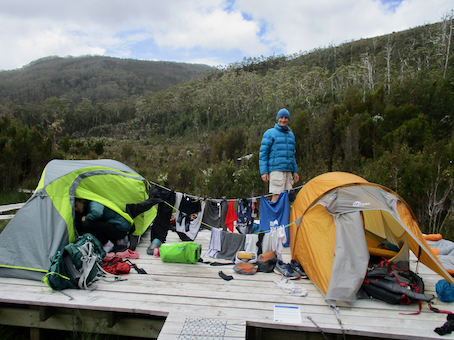 Eventually we arrived back at the Vera Hut campsite just as the rain was clearing. We’d taken about 3.15 hours so we were a bit quicker than the day before - mostly due to not stopping to admire the views I think! Everyone was keen take the afternoon off so we set up our tents on the platforms again and got completely changed our of our wet gear before enjoying lunch in in the hut. Jon and Jett didn't have pack covers so Jon quickly set up his own laundry and hung all their stuff out to dry.