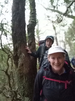 After about an hour the smoke seemed to have magically turned into heavy clouds and it started to drizzle, followed quickly by heavy rain. We were taken quite by surprise and had to scurry to put on pack covers and rain coats. By the time we were back at the pass we were all pretty soaked and keen to just keep moving. The rocks and roots which were grippy the day before were now slippery so we had to be extra careful descending.