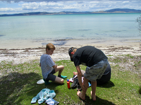 It was after the card game that they decided to start on dinner. It's also where the photos stop and my worst case scenario came to reality. From what I've been told, they started up the stove and firstly boiled a few loads of water and poured it into their empty water bottles, so it would be good to drink the next day during their hike out. Then they boiled more water and poured it into Toby's noodle cup thing. Then, in the act of putting two minute noodles into the next lot of boiling water Zali and Jett overbalanced the cooker (the exact details are a bit hazy but I think Jett was putting noodles into the water while Zali was trying to stabalise the cooker with the tongs she had in her hand) and it tipped up, pouring boiling water onto Miley's nearby sock-clad feet. Unfortunatly at this exact moment, Miley wasn't looking, so the first thing he knew was that his feet felt like they were on fire. He immediately took of his socks and the rest of them poured what cold water they had left onto his feet. Them Miley raced down to the beach and stood in the water. This is when Jon and I received the phone call from Jett. We'd recently returned to our accomodation after our long run/hike, and I was moments away from starting dinner. We quickly jumped in the cars (we needed to take two so we could get all 4 kids to the hike), and drove out to assess the situation. It was immediately obvious that Miley needed to go to hospital - the skin peeling off both his burnt feet and it looked pretty bad. Miley was really calm while he stood in the ankle deep water but it was incredibly painful if he came out. The others were distraught and quite shaken up so we set about packing up the camp while Jon talked on the phone to various health professionals to get advice on how to transport Miley. We could get him into the car easily enough, but once his feet were out of the water he was suffering a lot. After being advised to wrap his feet in a wet towel Jon headed off to RHH with Miley and Toby, while Zali, Jett and I returned to our accommodaiton at Nubeena to pack up the rest of our stuff then follow them home to Kingston. Jon tells me that the towel wasn't helping Miley much, and the nurafen I'd given him before he left wasn't making much of a dent in the pain, but luckily Denny had called ahead and somehow convinced the Dunalley Hotel to provide them with a bucket that Jon could pick up on his way past about 30 minutes into the 80 minute journey. Filled with water it made a huge difference for Miley. Jon met Robin at the Royal Hobart Hospital where he was eventually treated and was able to go home at about midnight. We were all hugely relieved to hear that the burns weren't the worst, and he's going to recover just fine. He won't be able to wear shoes for a while. Thank goodness. My three biggest concerns for this trip were always a snake-bite, tree-fall, or a cooking accident. In fact earlier in the day I said to Jon that I was looking forward to it being later in the evening as then I wouldn't have to worry about them having any cooking accidents anymore as they were planning on just having cereal for breakfast. We couldn't do anything about a tree-fall (except keep them inside forever), and a snakebite was pretty unlikely. So getting the phonecall from Jett about a completely avoidable accident was the worst. It certainly wasn't the lesson I was hoping they'd learn from this but there's absolutely no doubt that they've learnt from it. Small decisions lead to big outcomes. We've talked since about how often it's not one single decision that leads to bad outcomes, it's the combination of small ones. and in this case I'd say it was the combination of the slopey ground (I had told them to cook on FLAT ground), the inherently tippy cooker - it's tall rather than wide, the careless handling - I suspect that as they hadn't had any troubles up until that point, they were perhaps getting a bit blase - as evidenced by the fact that two people were attempting to doing something with it at once (Zali and Jett both feel terrible about what happened), the closeness of Miley's un-shoed feet and of course general inattentiveness all around. On the other hand I'm thankful for the small decisions I made before they did their hike. If they hadn't had mobile coverage, or we hadn't had a way to get them out without having to walk, or even if we'd camped for free at Fortescue Bay which would have been more than 50 minutes away rather than paying for accommodation much closer, the whole situation would have been much worse. On the bright side, Miley is going to be ok (giant relief), and I'm confident I no longer need to worry about this as they will never again make the same mistakes when it comes to using that stove. It's still such as shame that trip ended this way as from all accounts (and the photos) they were having a fantastic time up until that point. Jett described it as a rollercoaster ride from having a blast, to feeling very very bad. Despite the trauma they are keen to do another hike which I am happy about. Hopefully Miley feels the same. :)