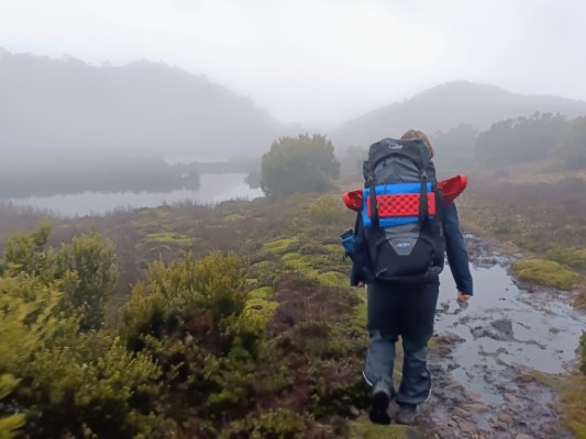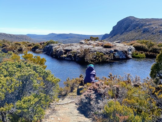 The views were fantastic from the top in a rare cloudless day - we could see all the way to Barns Bluff and Cradle Mountain and even beyond. Despite dawdling on the way down including stopping for Jo to take a dip in one of the tarns, we were back at camp by 11am. Our original plan was to take a lunch break and then head up another of the nearby peaks despite the route looking slightly perilous as it was covered in snow. When Jo suggested that instead we take advantage of the continued good weather to move ourselves to a new campsite, thus making the walk out in the rain the next day a much more managable distance we all immediately agreed and packed up our gear after lunch. The next campsite was down at Lake Adelaide - about 5 kms away. This part of the route was new and made it possible to do a nice loop rather than having to just walk in and out. It was a beautiful trip down through a pencil pine forest then alongside Lake Walls with a final little saddle over then down to Lake Adelaide. Unfortunately the campsite wasn't as adjacent to the lake as we would have liked but it was still nice. I should say that the toilets at both campsites were incredibly civilised and pretty much brand new. Quite the hiking treat.