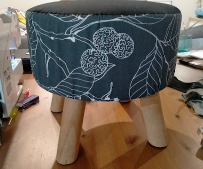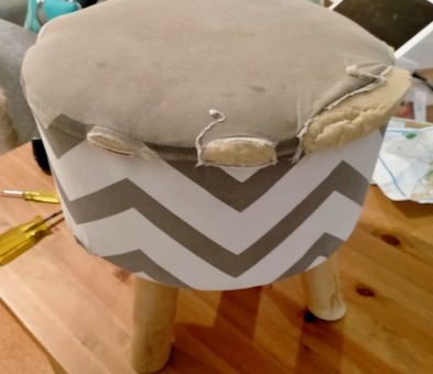 I am no upholstery expert but I figured in this case I couldn't do worse than the state of the Denny's foot stool before I started..