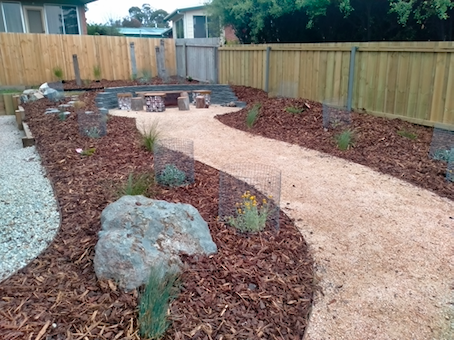 It's lovely. And it's not just the outcome, it's also the knowledge that this is the result of our hard work as well as the forced labour of many (most) of our friends and family - from planting to digging to watering to shovelling loads and loads of topsoil and mulch around. We're having a constant battle with the the wallabies and the occasional deer - every time I decide a plant is mature enough to un-cage (they seem to mostly focus their attention on the supple new plants), they decide it's still delicious and nibble it down to the ground - they owe us $100s in nursery costs. The grasses seem to mostly have survived although there are a few they simply won't leave alone which is weird as to the naked eye they look exactly the same as the one beside it which is untouched.