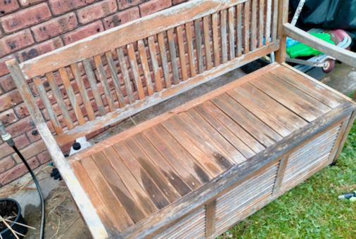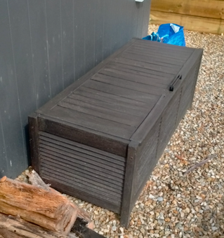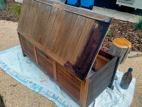 The fire pit at St Helens is looking a lot nicer now that we've done all the landscaping - consequently it's getting a bit more use from guests. We don't guarantee that there will be wood for it (they have instructions to buy it from the service station) but it is nice to provide it when we can. Up until now we've just been using an old ikea bag for the sticks, but with a few different guests staying before we are back to refill it, we needed a better and dryer way of storing it. I investigated buying something but that would have cost a few hundred bucks so then I investigated what we had lying around the house, and it turned out we had something perfect - our storage seat that we never sit on: