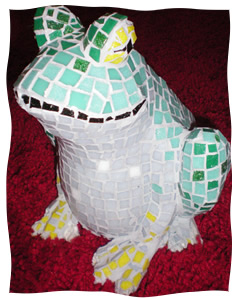 Amazingly I got the chance to do a little bit of craft recently - this frog is almost finished - unfortunately I have to redo his feet as I lost a lot of tiles during the grouting process. Sadly cakes and teeny tiny glass fragments don't really go together so he'll have to wait for his feet fix for a week or so while I get 3 cakes out of the way. He would have had green feet to match the rest of him but I've run out of tiles. The next frog I make will have to be purple as I'm down to my last few sheets of tiles.