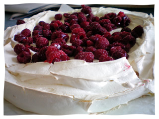 My friend Clare is temporarily back from the States collecting herself after what must have been a humiliating and soul destroying thanksgiving day baking failure*. In the interests of getting her life back on track we did some pavlova recipe testing yesterday. We also did some choc-chip muffin testing, some spicy-potato-wedges-with-home-made-mayonaisse testing, and some sausage-sanger-for-lunch-in-front-of-the-grand-final testing and I have to say that it was all VERY successful. So successful in fact that today I made my second ever pavlova (actually I helped make 2 yesterday so it's technically my third) with what we decided was the superior recipe. (I'll put it on the cakewoman tips recipe page soon). It looks good doesn't it!